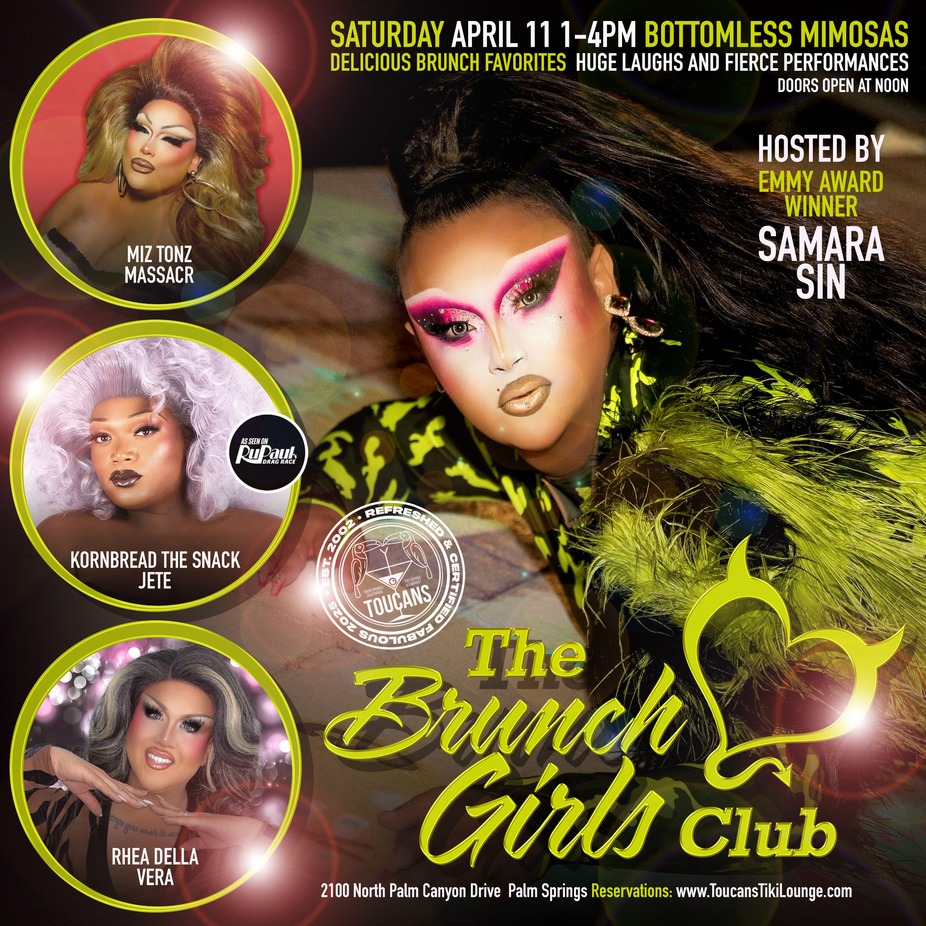 THE BRUNCH MUST GO ON! The BRUNCH GIRLS Club AT TOUCANS! Get ready for a brunch that’s better, juicier, bubblier, and bigger than ever! Toucans Drag Brunch - every Saturday at 1 PM — and we’re bringing BIG DRAG ENERGY with delicious food, fun, and fabulousness. Expect: Bottomless mimosas / Delicious brunch favorites / Huge laughs and fierce performances. We’re celebrating the Magic of Drag with LOCAL FAVORITES seasoned with Regional and Celebrity Queens for a drag experience that serves your soul and fills your tiny little belly. Kick off your weekend with food, fun, and fabulousness — only at Toucans!